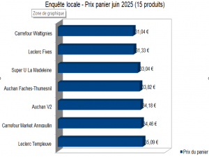 Le panier du magasin CARREFOUR Wattignies se monte à 32,12€, celui d’AUCHAN V2 à 32,14€, puis LECLERC Carvin à 32,60€ et AUCHAN Faches-Thumesnil à 32,65€. Enfin SUPER U La Madeleine maintient certains prix (l’eau Cristaline en pack de 6, les œufs par boîte de 6 et le litre de lait ½ écrémé Lactel), mais le panier s’élève à 32,65€. AUCHAN Englos ferme la marche avec un panier à 33,27€.