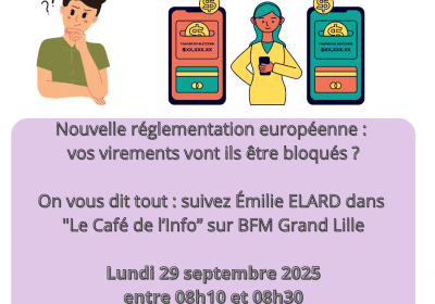 Nouvelle réglementation européenne : vos virements vont ils être bloqués ? On vous dit tout : suivez Émilie ELARD dans "Le Café de l’Info” sur BFM Grand Lille Lundi 29 septembre...